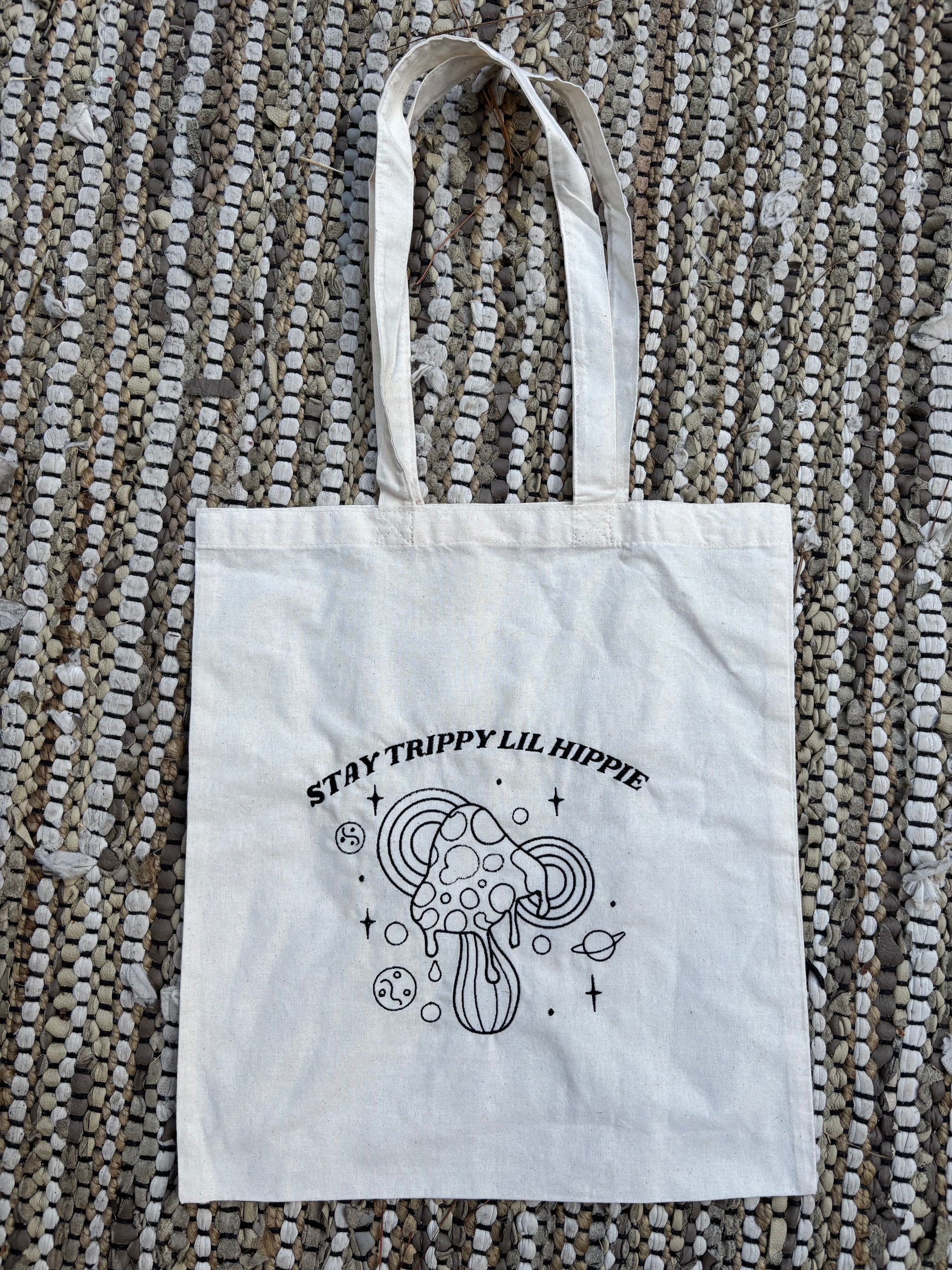 Recycled materials for bags, embroidered by local embroiderer. Design from local designer (Jay Braswell). All are the same! If unsure about what you're getting, email me at ecorevivalbiz@gmail.com for more pictures or use the contact us form on the website.